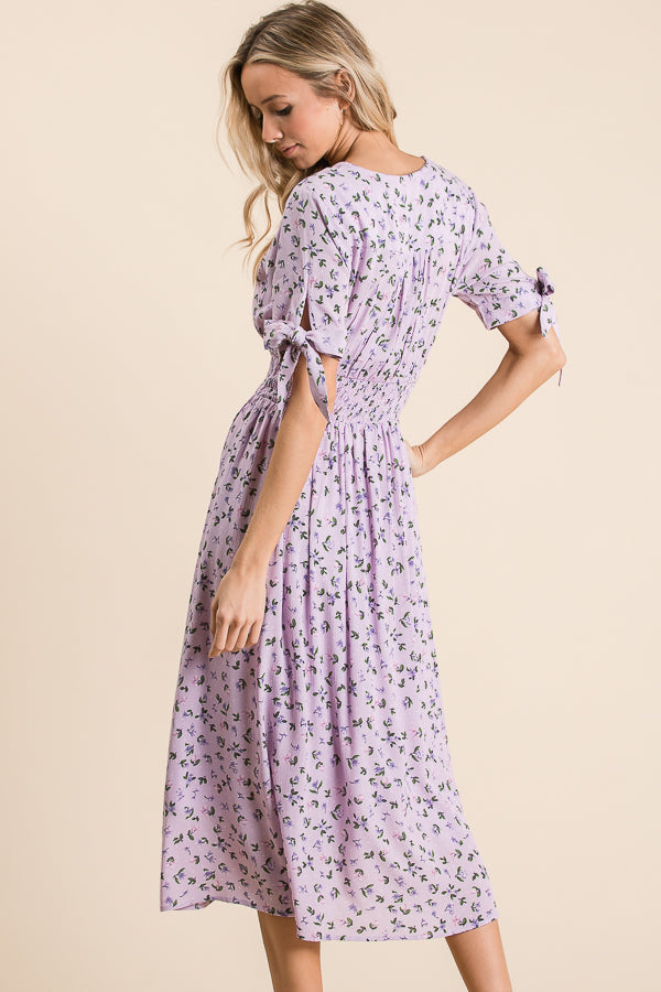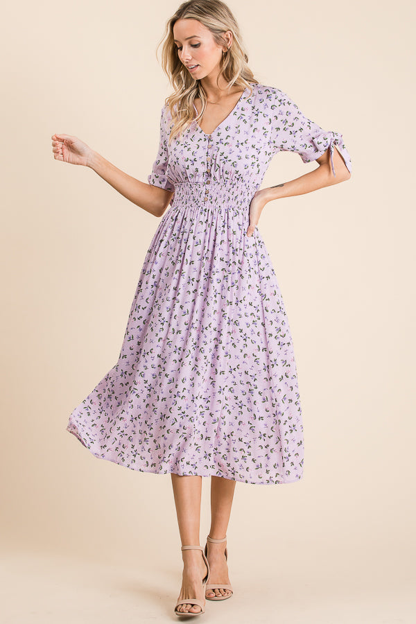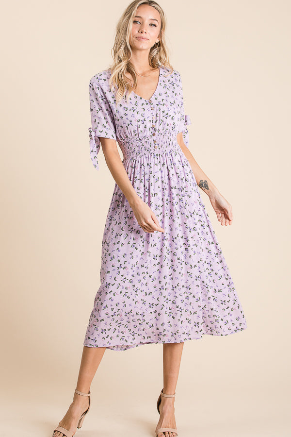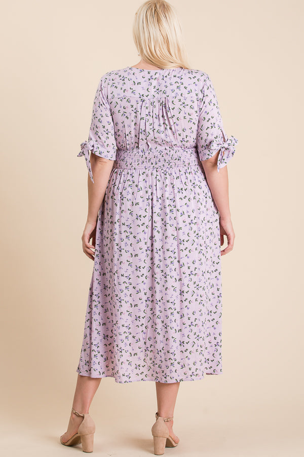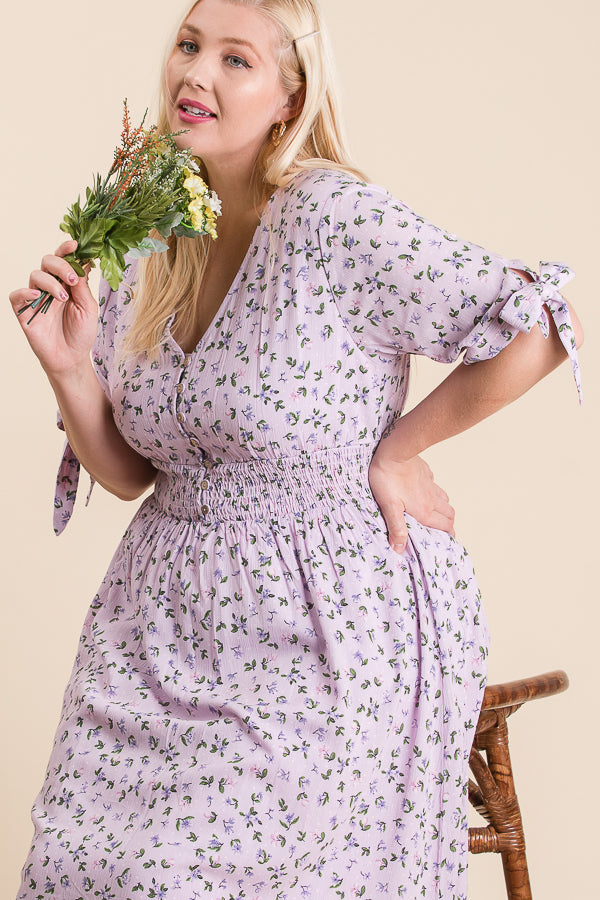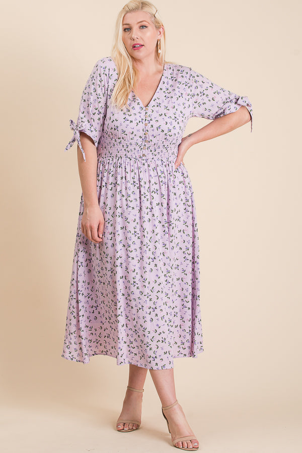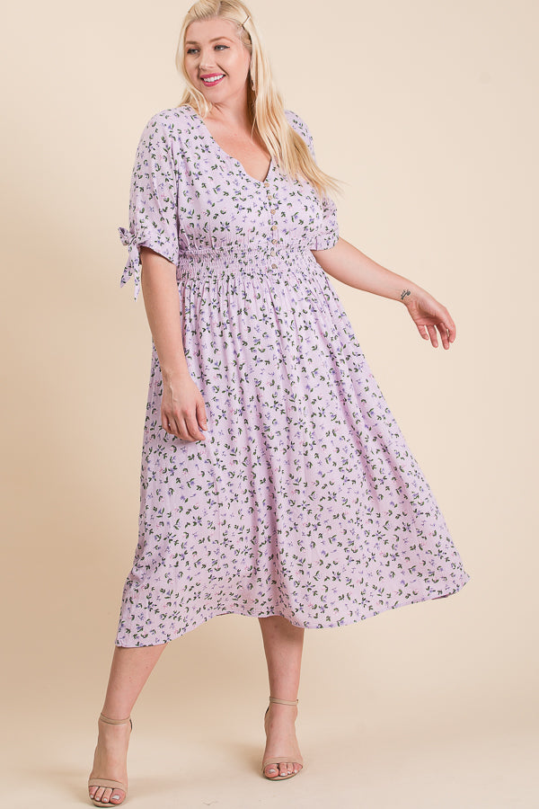 * Delicate floral midi dress with wooden button closure on front * Smocked waist * Skirt portion and front body with lining * Ribbon detail on sleeves * Model's are 5'9" wearing a small & 1XRead more