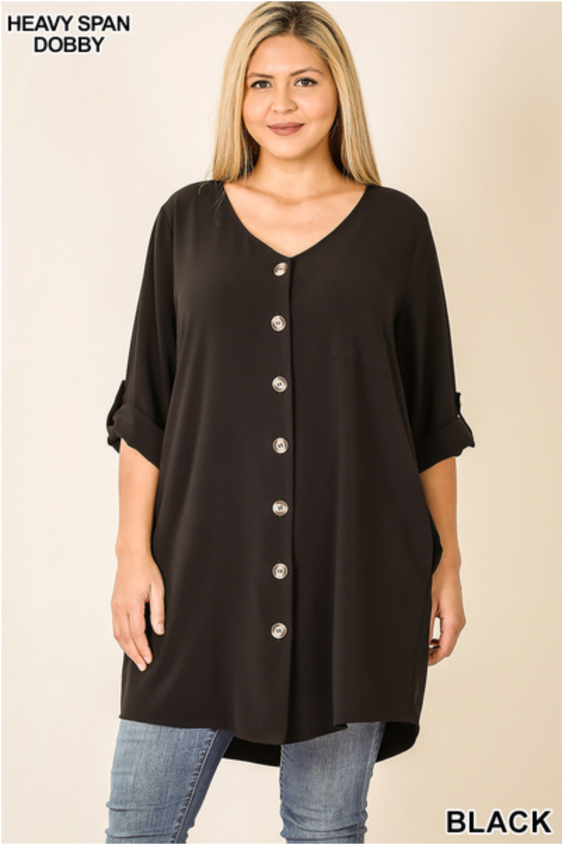 BUTTON FRONT TUNIC DRESS WITH SIDE POCKET - ROLL UP SLEEVES - BEST QUALITY WOVEN