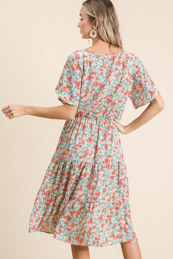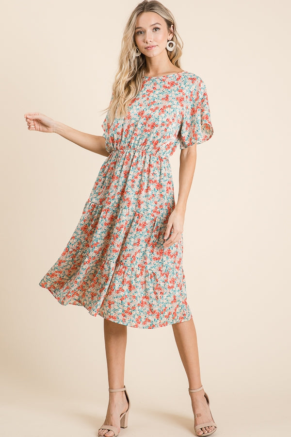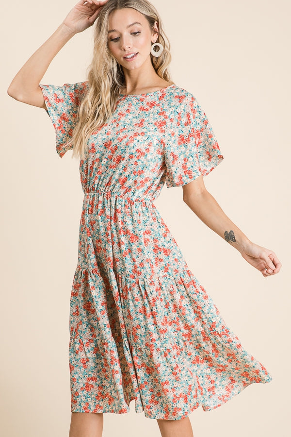 * Round neck * Short ruffle sleeves * Elastic seamed waist * Tiered skirt with flowy silhouette * Made with cupro satin mini freesias poly fabric * Model is 5` 9" wearing size SMALLRead more