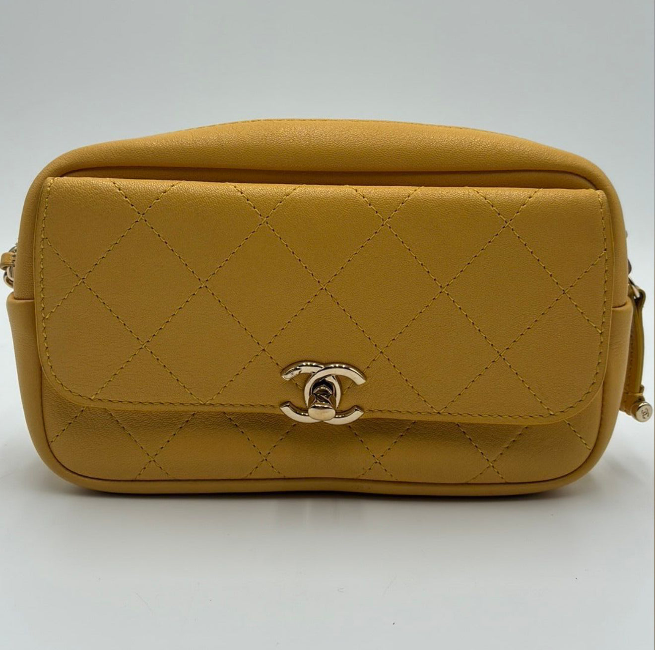 Chanel Calfskin Belt Bag in the color Yellow with a CC turn-lock pocket on the front and a main zip compartment lined with fabric. The bag has a soft creamy yellow hue complemented by shiny gold-tone hardware. It has an adjustable waist belt for a hands-free style moment. With Certificate of authenticity - https://cert.entrupy.com/DB4HG7W Excellent condition Preloved - Untouched