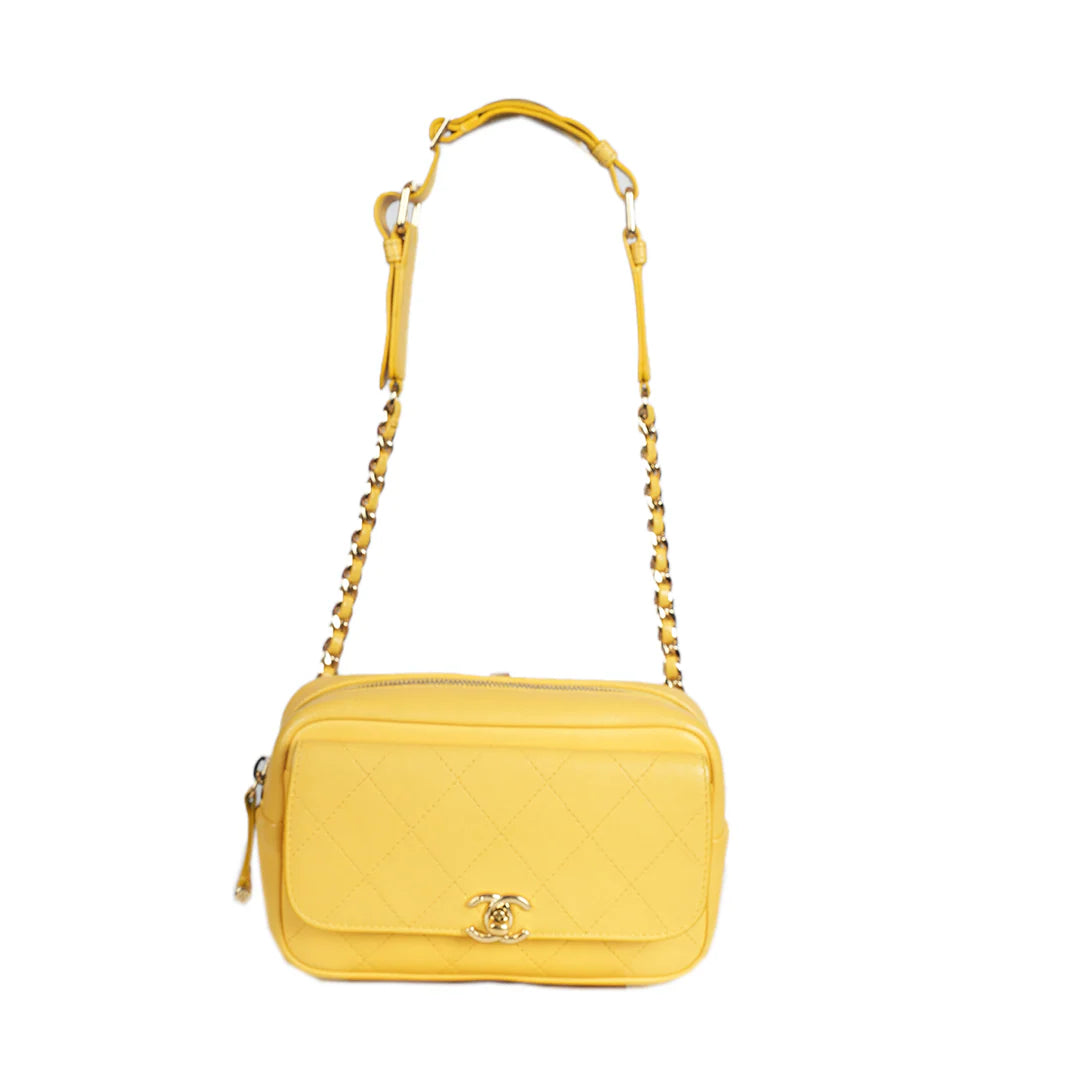 Chanel Calfskin Belt Bag in the color Yellow with a CC turn-lock pocket on the front and a main zip compartment lined with fabric. The bag has a soft creamy yellow hue complemented by shiny gold-tone hardware. It...Read more