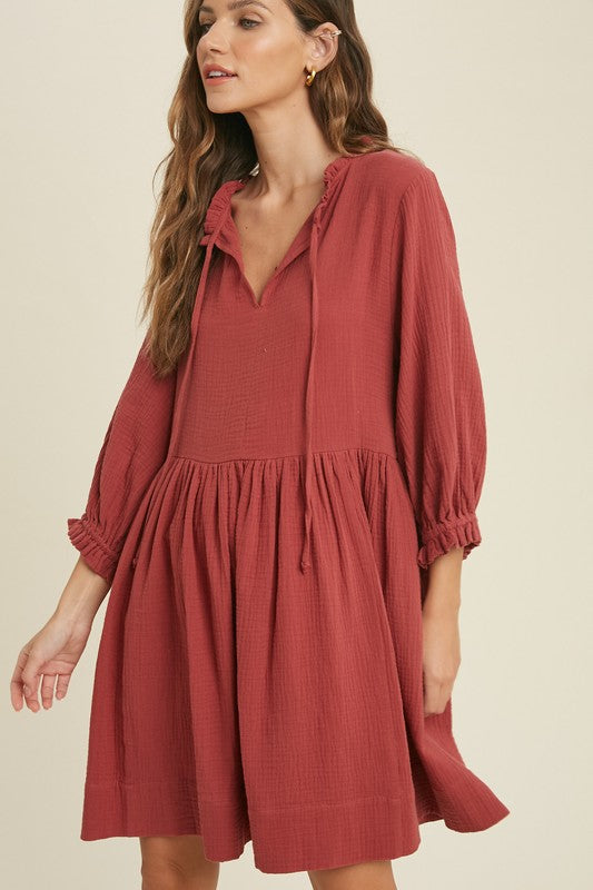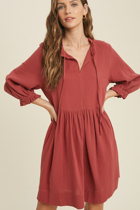 - COTTON TEXTURE FABRIC - CONVERTIBLE FRONT TO BACK - RUFFLE DETAILS - FRONT & BACK TIE - 3/4 SLEEVES - ELASTICIZED CUFFS - SIDE POCKETS - RELAXED FIT 100% COTTON